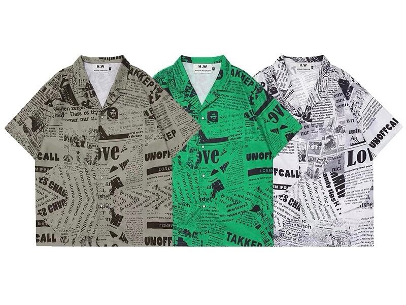 英字新聞 アルファベット 文字柄 開襟シャツ 半袖シャツ 白 緑 グレー