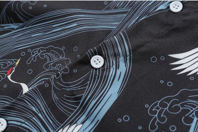 鶴 レトロ グラフィック アニマル柄 長袖シャツ 白 黒