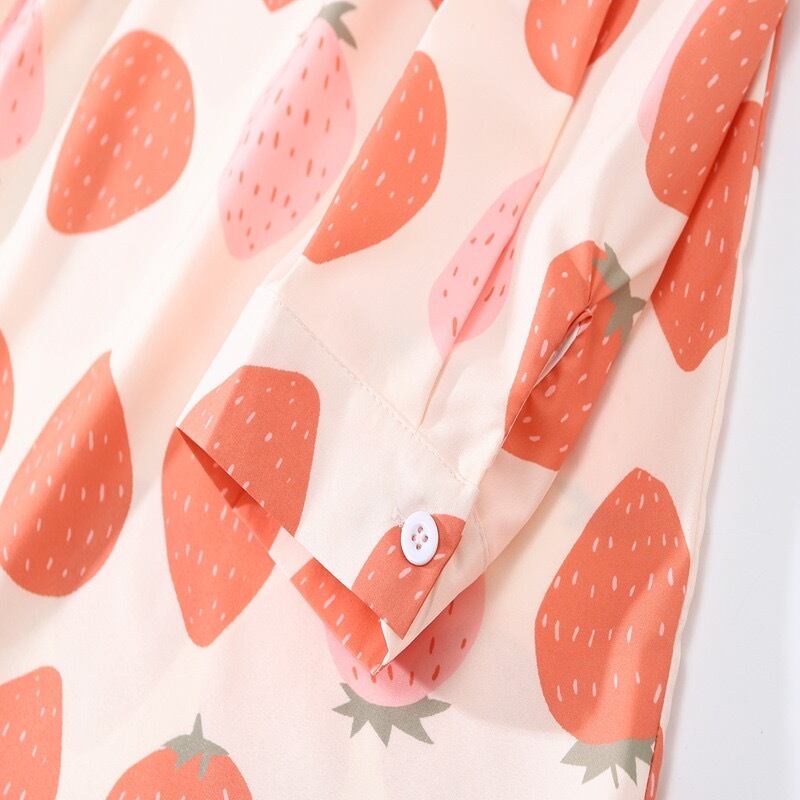 イチゴ 食べ物柄 苺 パターン 長袖シャツ 青 緑 ピンク