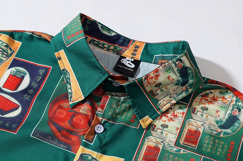 中華柄 レトロ グラフィック 半袖シャツ 緑 ベージュ