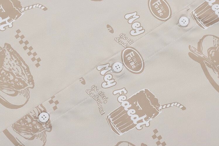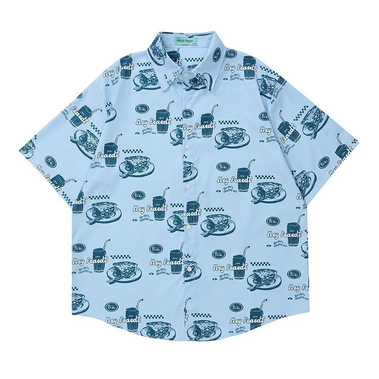 パイ 食べ物柄 半袖シャツ 青 ベージュ