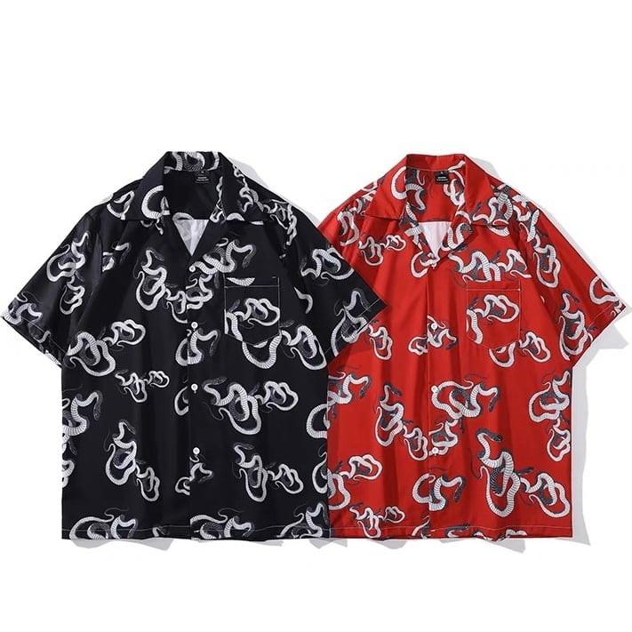 スネーク 蛇 アニマル柄 開襟シャツ 半袖シャツ 赤 黒
