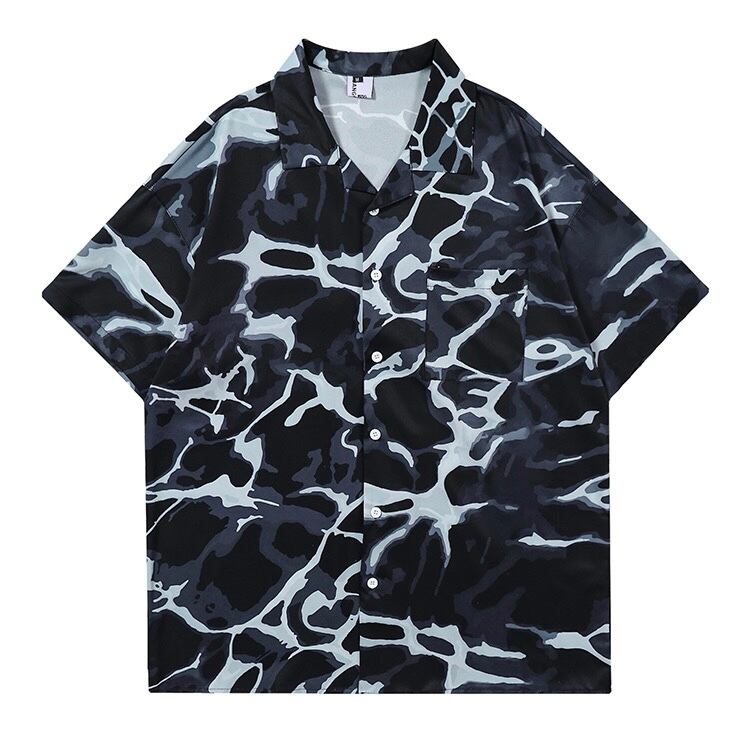 アートプリント 水辺 海 開襟シャツ 半袖シャツ 青 黒
