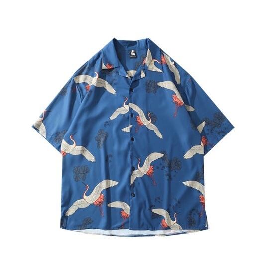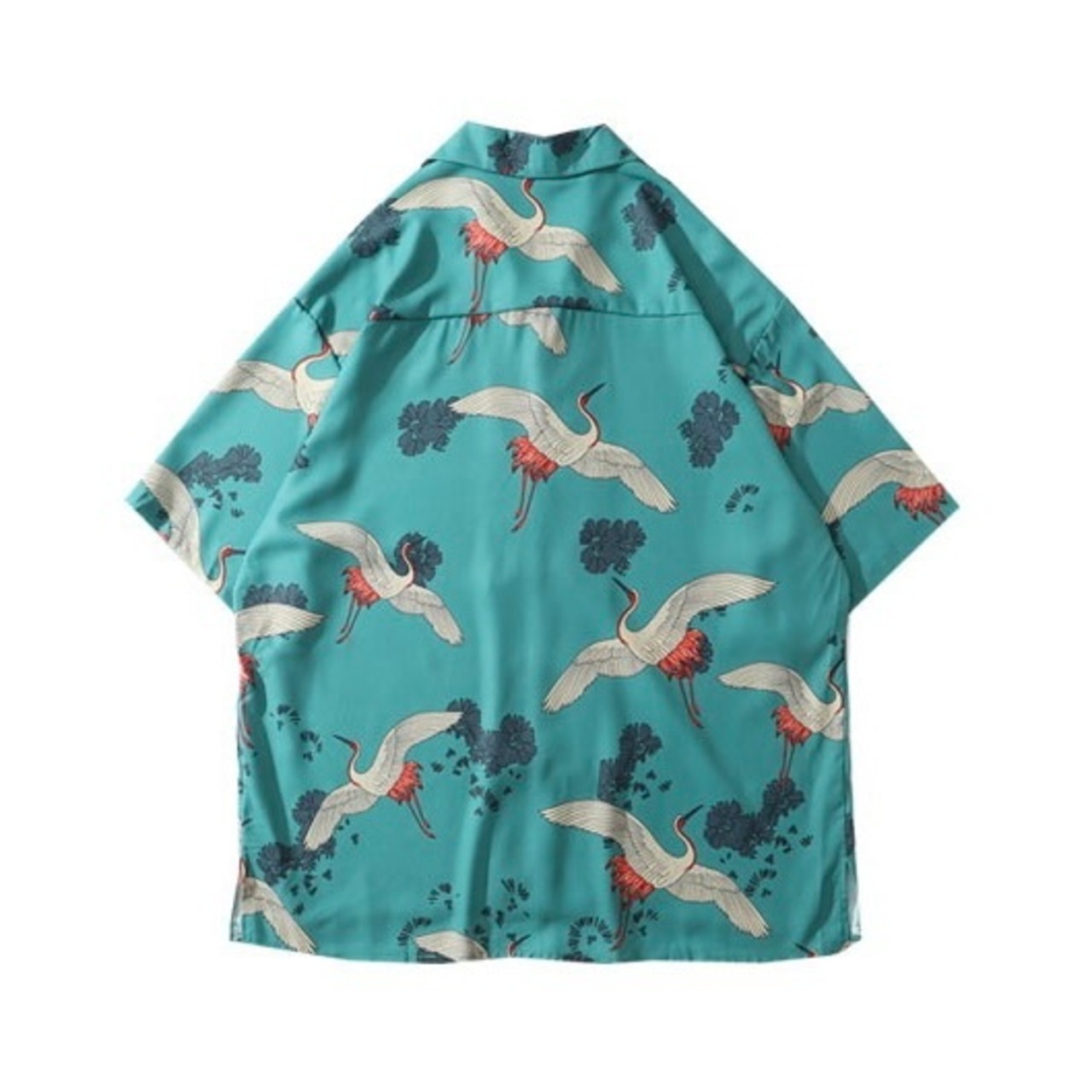 鶴 アニマル柄 開襟 半袖シャツ 白 黒 緑 青