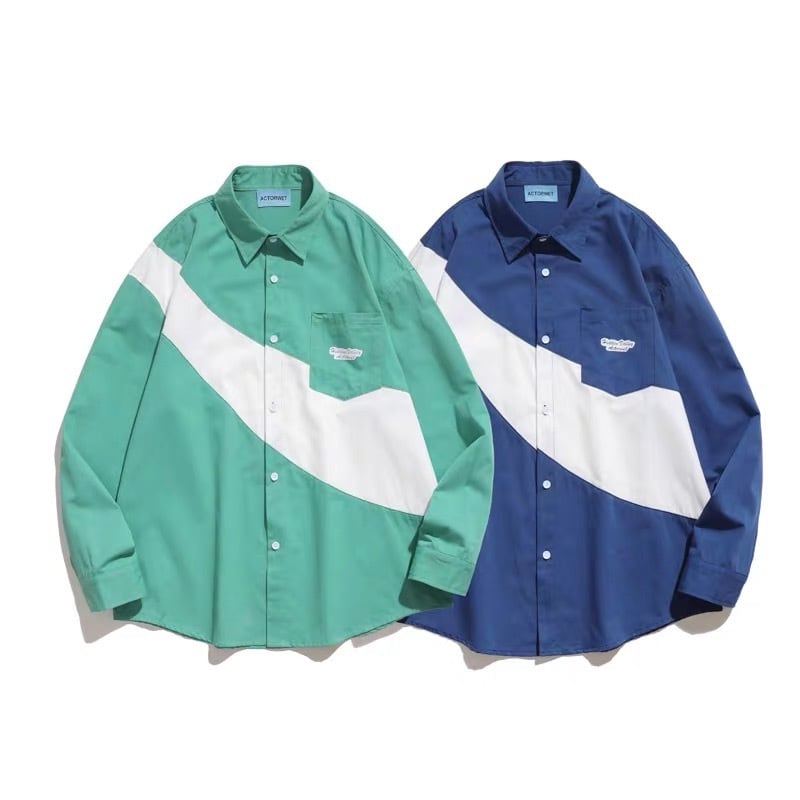 レトログラフィック 切り替え 長袖シャツ 青 緑