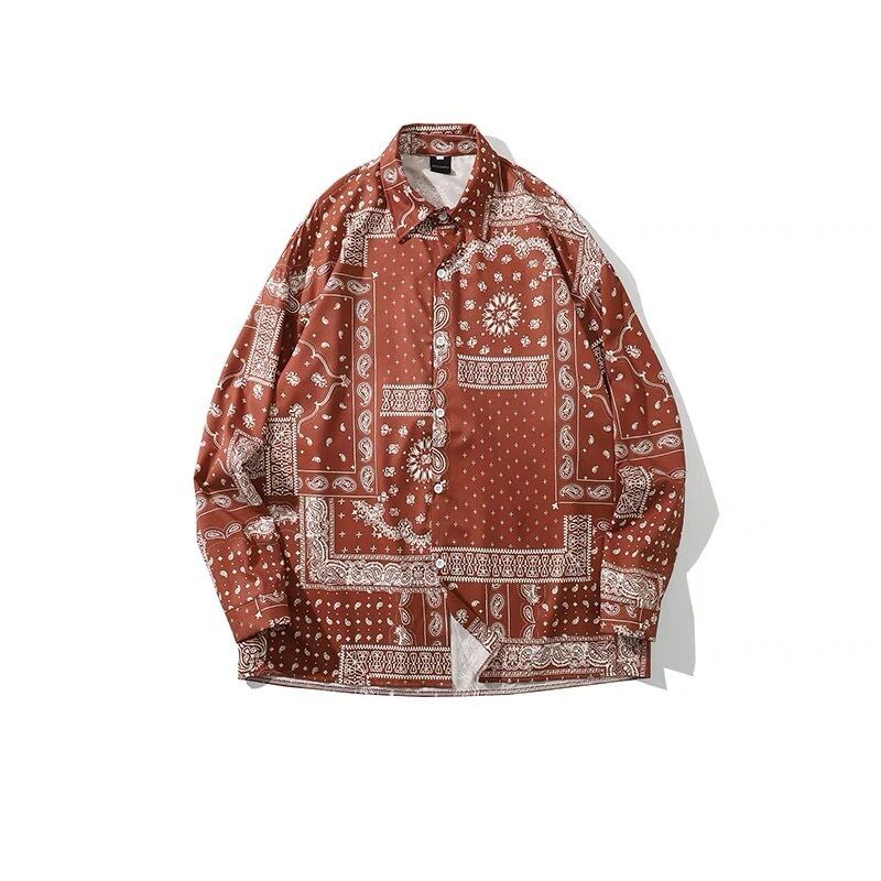 ペイズリー スクエア コラージュ 長袖シャツ 赤 青 黒