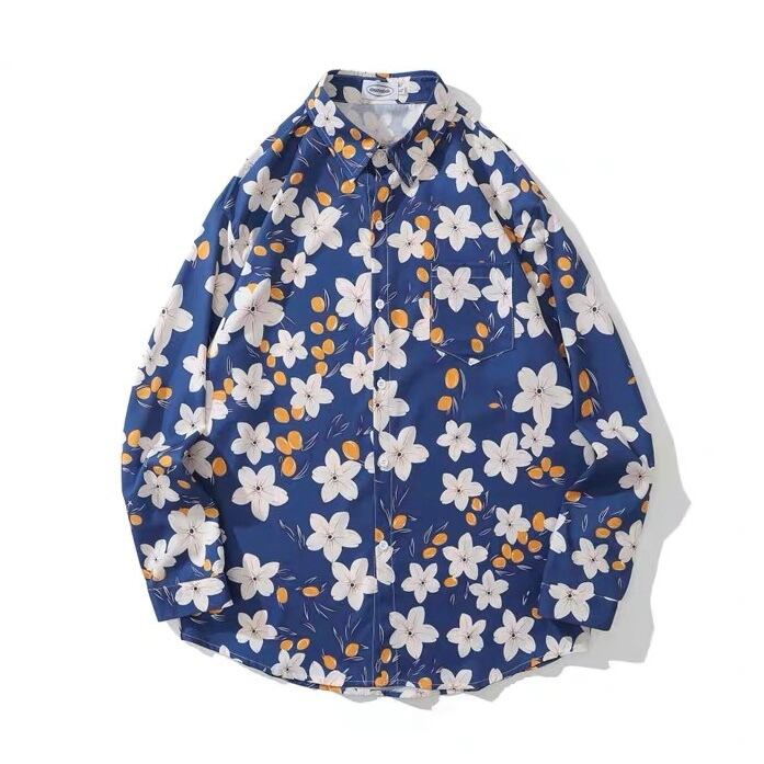 ボタニカル 花柄 長袖シャツ 青