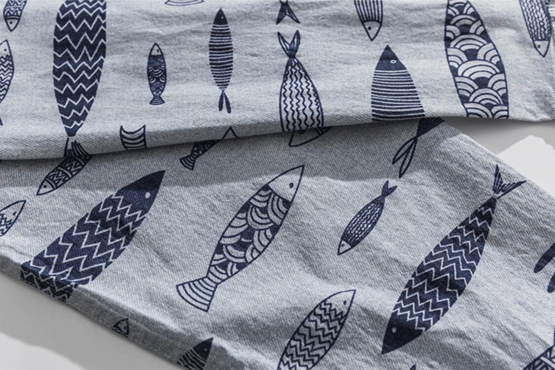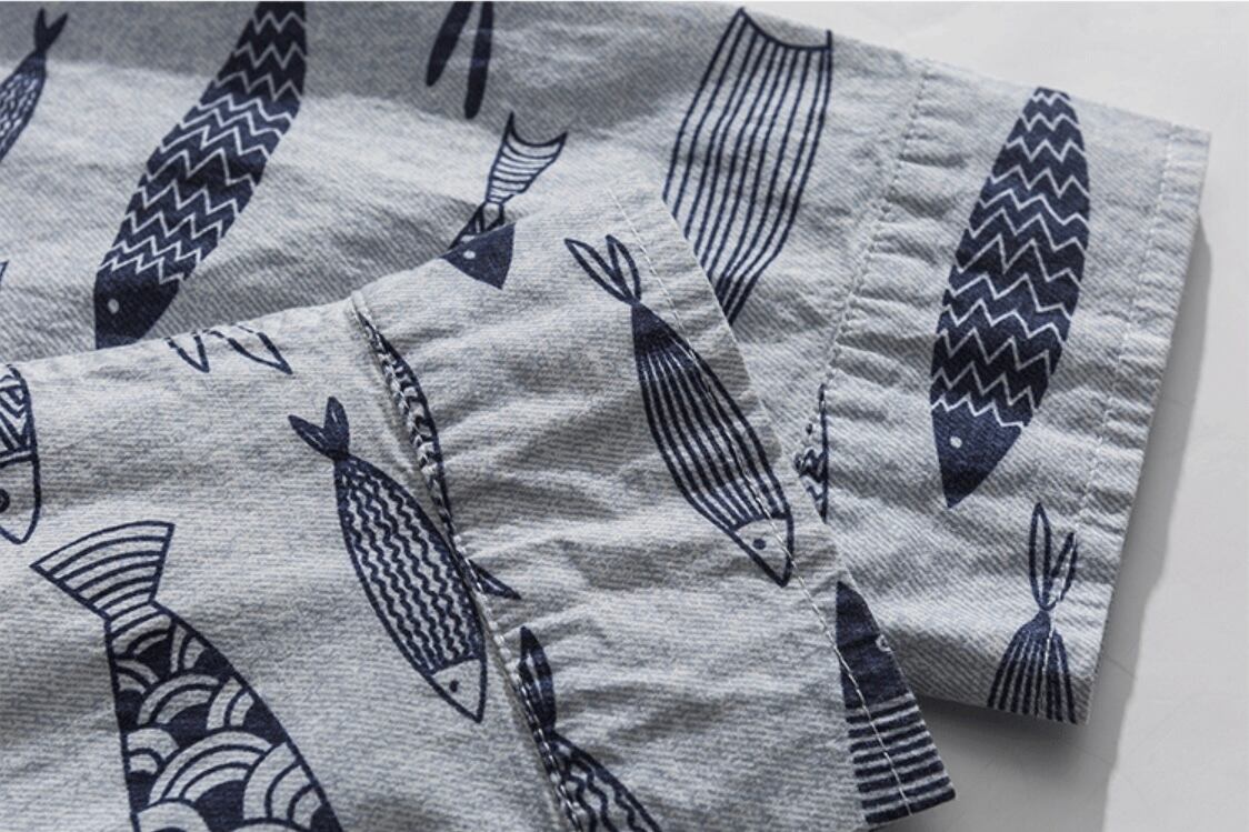 魚 アニマル柄 長袖シャツ ベージュ 青