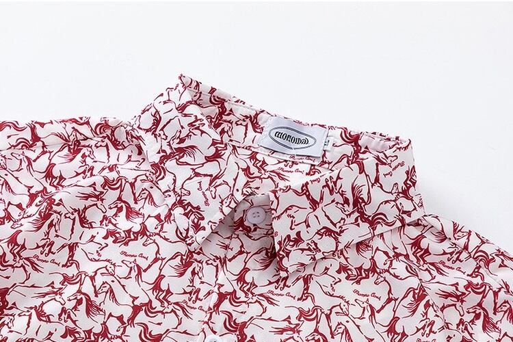 馬 アニマル柄 アロハ 半袖シャツ 青 赤